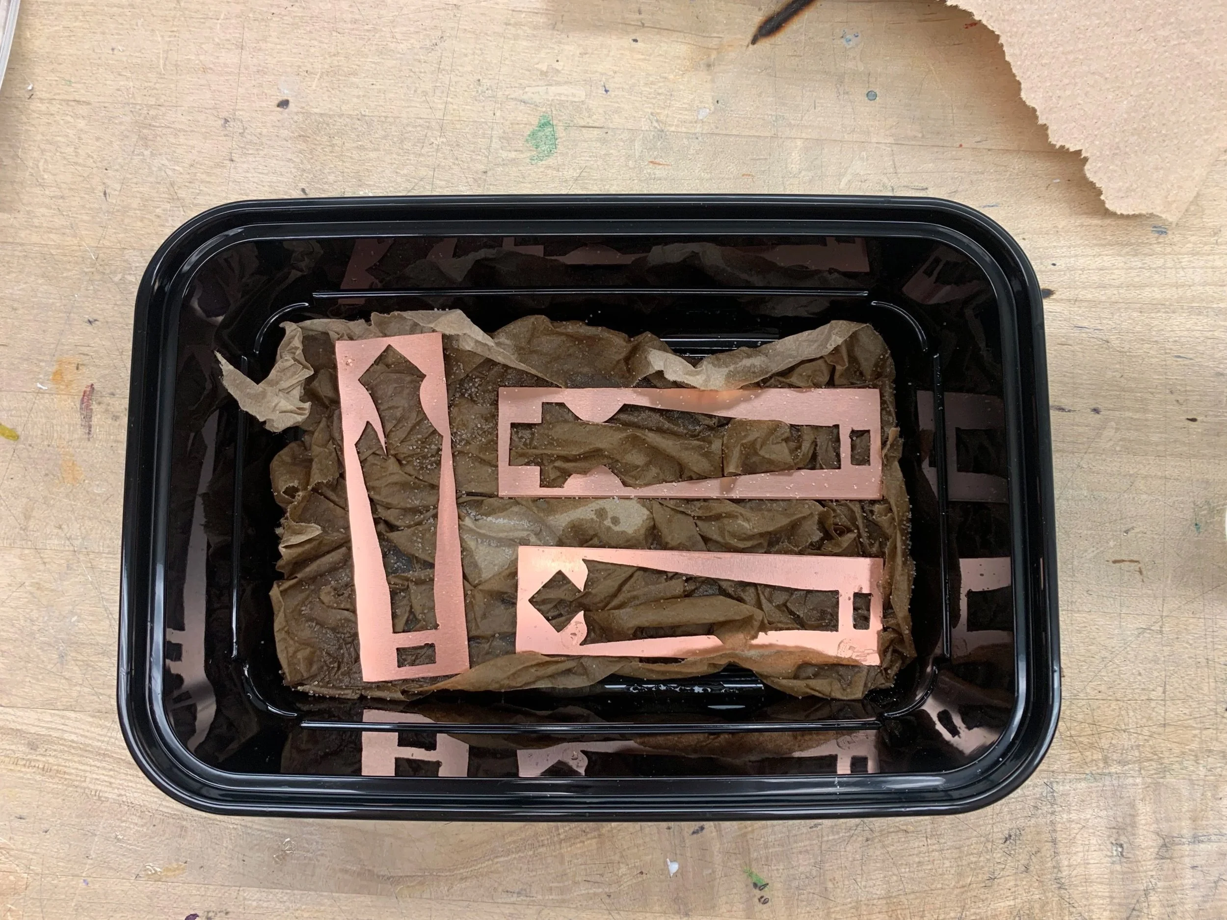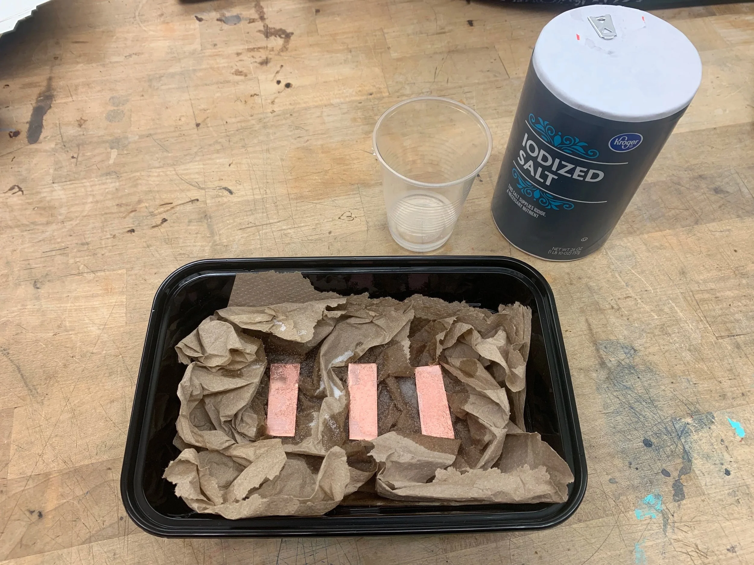 Salt was sprinkled on the copper which sat in a container on paper towels that were dowsed in ammonia.